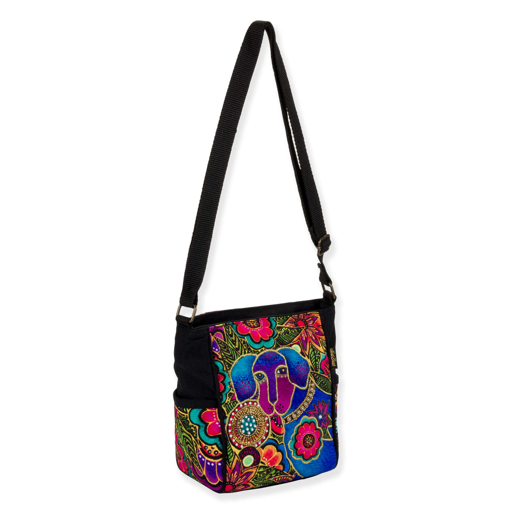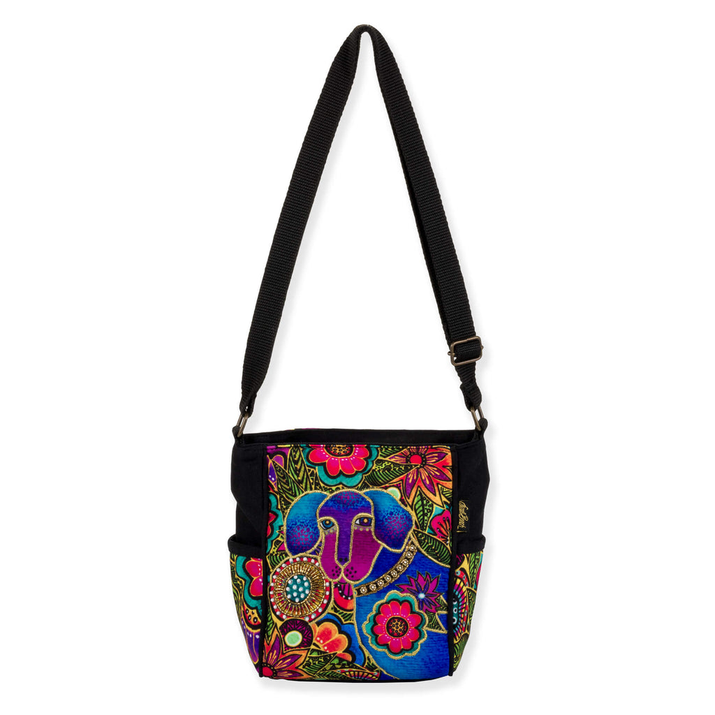 Laurel's bright blossoms and a soulful pup come to life on this creatively imagined crossbody. Painted in radiant purples, blues, and fuchsias, her design celebrates loyalty and joy with every detail. Lightweight yet roomy, with side pockets and an adjustable shoulder strap.