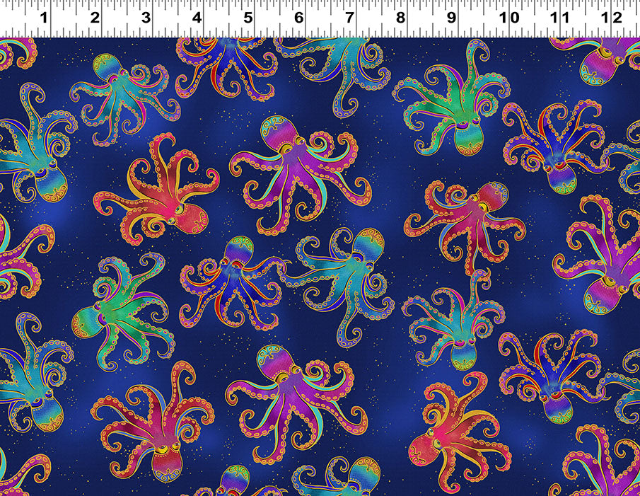 Oceania Octopi by-the-yard - Navy Blue/Gold Metallic