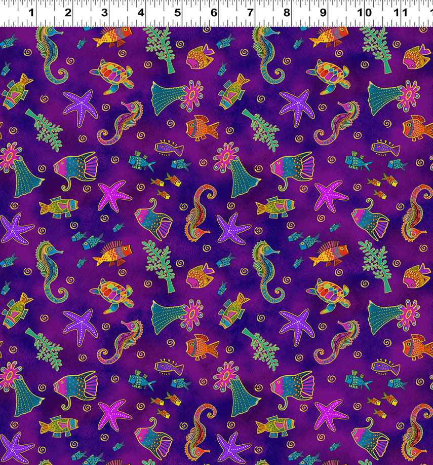 Immerse yourself in our vibrant new Oceania collection from Laurel's legendary imagination! This whimsical, rainbow-hued print captivates with a playful assembly of her beloved seahorses, turtles, and charming tropical fish against a rich dark orchid background glinting with gold metallic threads.